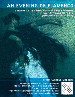 ![]() CROSSPATHCULTURE presents ![]() An Evening of Flamenco Saturday March 23, 2002 8pm CrossPathCulture NYC | 135 West 50th Street, ground floor CrossPathCulture (CPC) is proud to present An Evening of Flamenco on Saturday March 23 at 8pm. Please join us to experience this art form from the South of Spain, featuring: Baile (dance) of Leilah Broukhim and Laura Montes; Cante (song) of Amparo Heredia; and Toque (guitar) of Cristian Puig. Tickets are $10 at the door. Wine will be served during intermission (Courtesy of Locanda Vini & Olii http://www.locandavinieolii.com) |
